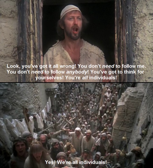 Waarheid, moraliteit ideologieën en utopieën nastreven is niet aan de staat of de politiek, daar komen ongelukken van groter dan de gewone tragedies waarmee we al hebben te leven. De staat heeft slechts voor die symbolische politieke orde zorg te dragen en inbreuken daarop tegen te gaan, waar nodig met zijn geweldsmonopolie, maar dat zelfde geweldsmonopolie legt ook een beperking op aan de staat. Dat monopolie mag slechts worden aangewend om de burgerlijke vrijheden van de democratische rechtstaat te waarborgen en die geven een burger het recht geen gebruik te maken van de Verlichtingsidealen en de rede. Frissen haalt hier ter illustratie Monty Python’s Life of Brian aan waarin ook weer een onbedoelde leider zijn volgelingen laat scanderen: “We are all individuals” . Maar een van hen roept dan: “No, I’m not” Frissen over deze onafhankelijke geest: Deze dissident die geen individu wil zijn, zal het ongetwijfeld zwaar krijgen als de grootst mogelijke meerderheid het individualisme wil collectiveren. Ik zou bijna met een beladen term “gelijkschakelen” willen gebruiken. Een terughoudende staat laat die ruimte voor die eenling die niet wil emanciperen of die zich obees wil (vr)eten.